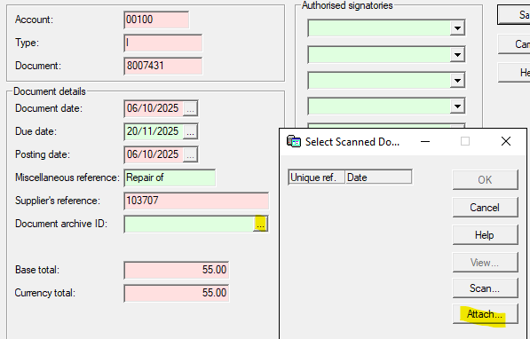 Enter the account number and find the transaction, click on the ellipsis at the right of the Document archive ID and there will be an attach option to allow you to select a PDF. (If the attach option is not shown please contact Systime Support to have it set up)