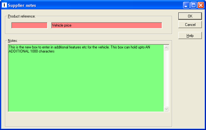 In addition there are an additional 1000 characters that can be made available for both New & Used vehicles, however these require an additional module to be added to the system and therefore incurs a one-off setup fee (CV Module). This then makes the Supplier Notes box available, selected by right clicking on the Vehicle price (selling price) spec line: